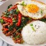 This 20 Minute Thai Basil Chicken (Pad Gai Krapow) is a quick and flavorful stir-fry dish featuring ground chicken sautéed with garlic, chilies, and fragrant Thai basil. Enhanced with a savory blend of soy sauce, oyster sauce, fish sauce, and a touch of sweetness, this authentic Thai street food favorite is served over steamed rice and topped with a fried egg, green onions, and sesame seeds for a satisfying meal.