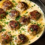 These amazing keto turkey meatballs are cooked to perfection with a flavorful blend of herbs and spices, then smothered in a rich, creamy Parmesan sauce. A low-carb, high-fat dish ideal for keto diets, they are browned in a skillet and finished under the broiler for a slight golden top. Perfect as a comforting main course that is simple yet indulgent.