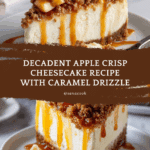 This Apple Crisp Cheesecake combines the creamy richness of classic cheesecake with the warm, comforting flavors of apple crisp. Featuring a graham cracker crust, a smooth caramel-infused cream cheese filling, a buttery oat topping, and fresh chopped apples, this decadent dessert is perfect for special occasions or cozy gatherings. Baked in a water bath to ensure a silky texture, it’s garnished with caramel drizzle and optional whipped topping for an extra touch of indulgence.