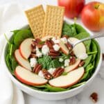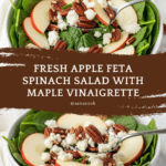 A refreshing and vibrant Apple Feta Spinach Salad combining crisp apples, salty feta, toasted pecans, and dried cranberries, all tossed in a tangy maple apple cider vinaigrette. This light, nutritious salad is perfect as a side dish or a healthy lunch option.