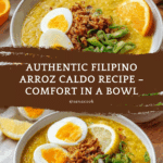 Authentic Arroz Caldo is a comforting Filipino rice porridge made with fragrant ginger, garlic, and turmeric, simmered with chicken and a mix of glutinous and jasmine rice. This hearty and flavorful dish is garnished with hard boiled eggs, fried garlic, green onions, and a squeeze of calamansi or lemon for a true taste of the Philippines.