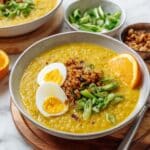 Authentic Arroz Caldo is a comforting Filipino rice porridge made with fragrant ginger, garlic, and turmeric, simmered with chicken and a mix of glutinous and jasmine rice. This hearty and flavorful dish is garnished with hard boiled eggs, fried garlic, green onions, and a squeeze of calamansi or lemon for a true taste of the Philippines.