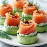 - Prepare salmon roses: While the mousse chills, roll the smoked salmon ribbons into rose shapes carefully, to be used as a decorative and tasty topping.