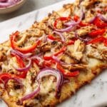 A quick and delicious BBQ Chicken Flatbread recipe featuring shredded chicken tossed in tangy BBQ sauce, topped with melted mozzarella, crisp red onions, and sweet peppers on a crispy flatbread base. Perfect for an easy lunch or dinner, this flatbread is baked to golden perfection and garnished with fresh herbs for a vibrant finish.