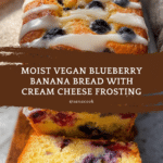 This Blueberry Banana Bread is a moist, flavorful vegan loaf packed with fresh blueberries and natural sweetness from ripe bananas and maple syrup. Made with a combination of all-purpose and almond flours, this bread is optionally topped with a creamy vegan cream cheese frosting, making it perfect for breakfast or a healthy snack.