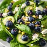 A fresh and vibrant Blueberry Pistachio Spring Salad combining mixed greens, juicy blueberries, crunchy pistachios, and creamy feta cheese, all tossed in a sweet and tangy honey balsamic dressing. Perfect as a light lunch or a springtime side dish.