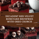 Boneyard Brownies are a deliciously rich and festive treat perfect for Halloween or any spooky occasion. These red velvet-inspired brownies are topped with chocolate, Oreo crumbs, and spooky chocolate skulls for a fun and impressive dessert.