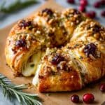 Keywords: Brie, Cranberry, Christmas Wreath, Puff Pastry, Holiday Appetizer, Festive Snack, Vegetarian, Baking
