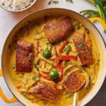This Caribbean-Style Coconut Curry Salmon recipe features tender salmon fillets seasoned with aromatic curry spices, seared to perfection, and simmered in a rich and fragrant coconut curry sauce infused with fresh bell peppers, onion, garlic, ginger, thyme, and a hint of Jamaican allspice. The dish captures vibrant Caribbean flavors and offers a comforting yet exotic meal perfect for any occasion.