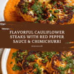 - Step 7: To serve, spread the roasted red pepper sauce on a plate. Place the cauliflower steaks on top, drizzle generously with chimichurri, and garnish with extra parsley.