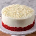 - Top with Second Cake Layer: Add the second red velvet cake layer on top of the cheesecake. Frost the top and sides of the entire cake evenly with the remaining frosting.