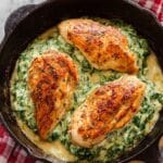 This Cheesy Spinach Stuffed Chicken Breasts recipe features juicy, boneless chicken breasts filled with a creamy blend of cream cheese, mozzarella, parmesan, and fresh spinach. The chicken is seasoned, seared to golden perfection on the stovetop, and finished in the oven to ensure a tender, flavorful meal perfect for a healthy dinner option.