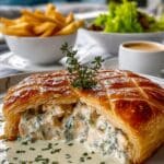 This dish pairs well with simple sides like roasted vegetables, mashed potatoes, or a fresh green salad to balance the richness of the pastry and sauce.