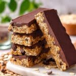 Store the protein bars in an airtight container in the refrigerator for up to one week. For longer storage, freeze them wrapped individually for up to one month. To enjoy, thaw in the fridge or at room temperature for 10-15 minutes before eating. Avoid leaving them at room temperature for prolonged periods, especially in warm weather, as the chocolate topping may soften.