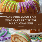 This Cinnamon Roll King Cake puts a fun twist on the traditional Mardi Gras treat by using jumbo cinnamon rolls as the base. Decorated with colorful swirls of green, yellow, and violet frosting, this easy-to-make cake is perfect for celebrations and comes with the classic hidden baby doll figurine tradition.