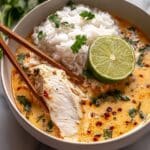 - Assemble and Serve: Divide the cooked rice into serving bowls, top with sliced chicken, and ladle the hot coconut broth over. Garnish with chopped green onions, fresh cilantro, and lime wedges for an extra burst of flavor and freshness.