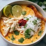 This Coconut Chicken Brothy Rice is a cozy, flavorful one-pot meal combining tender chicken thighs simmered in a fragrant broth of coconut milk, garlic, ginger, and spices, served over fluffy jasmine rice and garnished with fresh herbs and lime wedges.