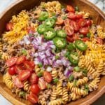 Keywords: Cowboy Pasta Salad, Tex-Mex salad, ground beef pasta salad, taco seasoned pasta salad, southwestern salad, hearty pasta salad