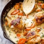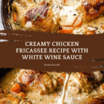 This classic Chicken Fricassee recipe features tender chicken thighs and legs simmered in a rich, creamy sauce infused with white wine, garlic, thyme, and fresh vegetables. Browned first on the stove and then baked to perfection, this comforting dish delivers a delightful blend of savory flavors and a velvety texture, perfect for a hearty family meal.