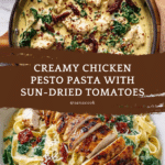 A rich and flavorful Creamy Chicken Pesto Pasta featuring tender chicken breasts cooked to golden perfection, tossed with al dente pasta in a luscious pesto cream sauce enhanced by sun-dried tomatoes and fresh spinach, topped with freshly grated Parmesan cheese for an irresistible meal.