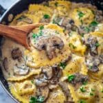 This creamy mushroom ravioli recipe features tender four cheese ravioli smothered in a luscious, garlicky mushroom sauce made with fresh sliced mushrooms, butter, and Parmesan cheese. It’s a comforting and elegant vegetarian pasta dish perfect for a weeknight dinner or special occasion.