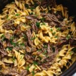 - Shred the Beef: Using two forks inside the crock pot, shred the beef into bite-sized pieces. Season with salt and pepper to taste. Add the egg noodles and optional mushrooms into the crock pot.