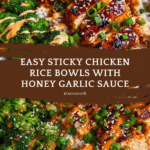 This Delicious Sticky Chicken Rice Bowl features tender, juicy chicken thighs cooked in a sweet and savory sticky sauce made with honey, soy sauce, garlic, and a touch of sriracha for a pleasant kick. Served over fluffy jasmine rice and garnished with green onions and toasted sesame seeds, this recipe is a simple yet flavorful meal perfect for a quick weeknight dinner.