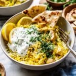 - Season and serve: Taste and adjust seasoning with additional salt and pepper if needed. Serve the chicken and rice hot, topped with a dollop of tzatziki sauce, fresh herbs, and a squeeze of lemon for bright, fresh flavor.