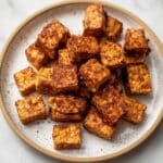 - Bake the tempeh: Spread the tempeh cubes evenly across the prepared baking sheet. Bake on the top rack of the oven for 25–27 minutes, or until the tempeh is golden and crispy. For an air fryer option, place the tempeh in the air fryer basket and cook at 380°F (193°C) for 12–15 minutes, shaking the basket every 5 minutes.