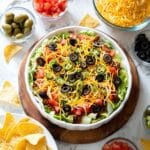 Top the creamy base evenly with chopped lettuce, tomatoes, bell peppers or jalapeños, sliced olives, and shredded cheddar cheese. Reserve about 2 tablespoons of any desired toppings to sprinkle over the cheese for presentation.