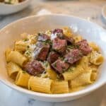 Keywords: Garlic Parmesan Steak Pasta, Ribeye steak pasta, creamy steak pasta, rigatoni with steak, garlic pasta sauce, steak dinner recipe