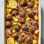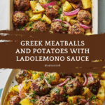 These Greek Meatballs and Potatoes are a hearty, flavorful dish featuring tender meatballs infused with aromatic herbs and spices, baked alongside golden Yukon gold potatoes and red onions, all drizzled with vibrant Ladolemono sauce. Perfectly balanced with cumin, coriander, and fresh parsley, this comforting meal brings authentic Greek flavors to your table with easy oven baking.