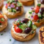 These Greek Salad Naan Bites with Hummus are a delightful and easy appetizer featuring warm, lightly pan-toasted mini naan bread topped with creamy hummus and a fresh, tangy Greek salad mixture. Perfect for parties or a light snack, they combine Mediterranean flavors in a bite-sized treat.