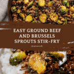 Keywords: ground beef recipe, Brussels sprouts, skillet dinner, quick dinner, healthy beef recipe, low sodium soy sauce, sweet chili sauce, easy weeknight meal