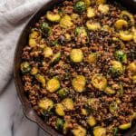 Keywords: ground beef recipe, Brussels sprouts, skillet dinner, quick dinner, healthy beef recipe, low sodium soy sauce, sweet chili sauce, easy weeknight meal