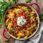 Keywords: ground beef casserole, enchilada casserole, Mexican skillet, easy dinner, one-pan meal