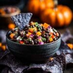This Halloween Bean Dip is a festive and flavorful appetizer perfect for spooky gatherings. Made with black beans, vibrant bell pepper, spicy jalapeno, and zesty lime, it offers a fresh and tangy taste that pairs perfectly with crunchy blue corn tortilla chips.