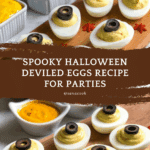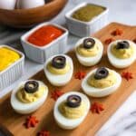 - Assembly and Decoration: Fill the egg white halves with the differently colored yolk mixtures using a spoon or piping bag. For “spider” eggs, add halved black olives as the spider bodies and thinly sliced chives or green onions as legs. Create “eyeball” eggs by adding small dots of cream cheese with paprika centers for a creepy effect.
