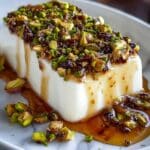 - Arrange and Drizzle Honey: Place the pistachio-coated cheese log on a serving tray. Generously drizzle honey over the top of the cheese to add sweetness and a glossy finish.