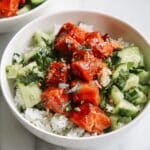 These Hot Honey Salmon Bowls with Sriracha Mayo are a perfect balance of sweet, spicy, and fresh flavors. Tender roasted salmon glazed with a sticky hot honey sauce is paired with a refreshing cucumber avocado salad and fluffy rice to make a satisfying meal.