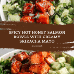Keywords: Hot honey salmon, salmon bowl, spicy honey glaze, sriracha mayo, healthy salmon recipe, roasted salmon bowl, fresh cucumber avocado salad
