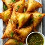 Store leftover samosas in an airtight container in the refrigerator for up to 3 days. To reheat, bake at 350°F for 10-15 minutes or until warmed through and crisp. Avoid microwaving as it may soften the crust.