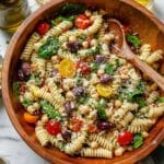 A vibrant and flavorful Italian Pasta Salad featuring fusilli pasta tossed with fresh vegetables, creamy cheeses, tangy pepperoncini, and a zesty homemade Italian dressing. Perfect as a refreshing side dish or light meal, this salad balances hearty chickpeas, sharp Parmesan, and savory olives for a satisfying Mediterranean-inspired dish.
