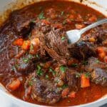 - Braise: Return the seared beef pieces back into the pot, making sure they’re submerged in the sauce. Cover the pot with its lid and transfer it to the preheated oven. Bake for 3 ½ to 5 hours, or until the beef is tender enough to be easily shredded with two forks.