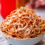 - Prepare the Crab: Julienne the crab sticks by running a fork through each one to separate into thin strands, then transfer them into a large mixing bowl.