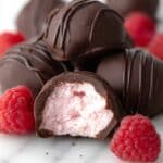 These Keto Raspberry Cheesecake Bites are a delicious low-carb dessert featuring creamy cheesecake mixed with fresh raspberries, sweetened with powdered sweetener, and coated in rich sugar-free dark chocolate. Perfectly portioned as bite-sized treats, they are satisfying and ideal for ketogenic diets.