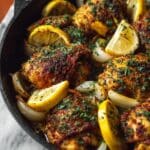 A flavorful Lebanese Chicken recipe featuring bone-in, skin-on chicken marinated in a blend of garlic, lemon, and warm spices, then roasted to crispy perfection. Perfect for a hearty and aromatic meal accompanied by fresh lemon wedges and parsley garnish.