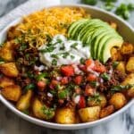 This Loaded Potato Taco Bowl combines crispy roasted russet potatoes with a flavorful ground beef or turkey mixture, black beans, corn, and fresh toppings like avocado, cherry tomatoes, and cilantro. Finished with melted cheddar cheese, a squeeze of lime, and a dollop of sour cream, it’s a hearty, satisfying meal perfect for taco lovers looking for a comforting twist.