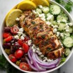 These Low-Carb Greek Chicken Bowls are a flavorful and healthy meal option featuring perfectly seasoned grilled chicken served over a refreshing Mediterranean-inspired salad with cucumber, cherry tomatoes, red onion, feta cheese, and kalamata olives. With only 12g net carbs, this dish is ideal for those following a low-carb lifestyle while craving delicious, satisfying flavors.
