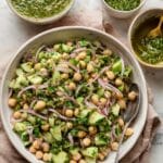 - Assemble Salad: To the bowl with onions, add the chickpeas, cannellini beans, drained cucumbers, remaining 1/3 cup chopped cilantro, and pour the blended dressing over. Toss thoroughly to combine all ingredients.